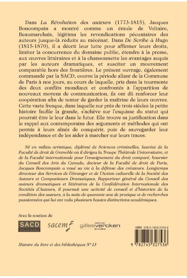 Dans La Révolution des auteurs, (1773-1815), Jacques Boncompain a montré comment, un émule de Voltaire, Beaumarchais, légitima les revendications pécuniaires des auteurs jusque-là réduits au mécénat. Dans De Scribe à Hugo, (1815-1870), il a décrit leur lutte pour affirmer leurs droits, limiter la concurrence du domaine public, étendre à la presse, aux oeuvres littéraires et à la chansonnette les avantages acquis par les auteurs dramatiques, et susciter un mouvement comparable hors des frontières. Le présent ouvrage, également commandé par la SACD, couvre la période allant de la Commune de Paris à nos jours, au cours de laquelle, en étant pris dans la tourmente des deux conflits mondiaux et confrontés à l’apparition de nouveaux moyens de communication, ils ont dû renforcer leur coopération afin de tenter de garder la maîtrise de leurs oeuvres.