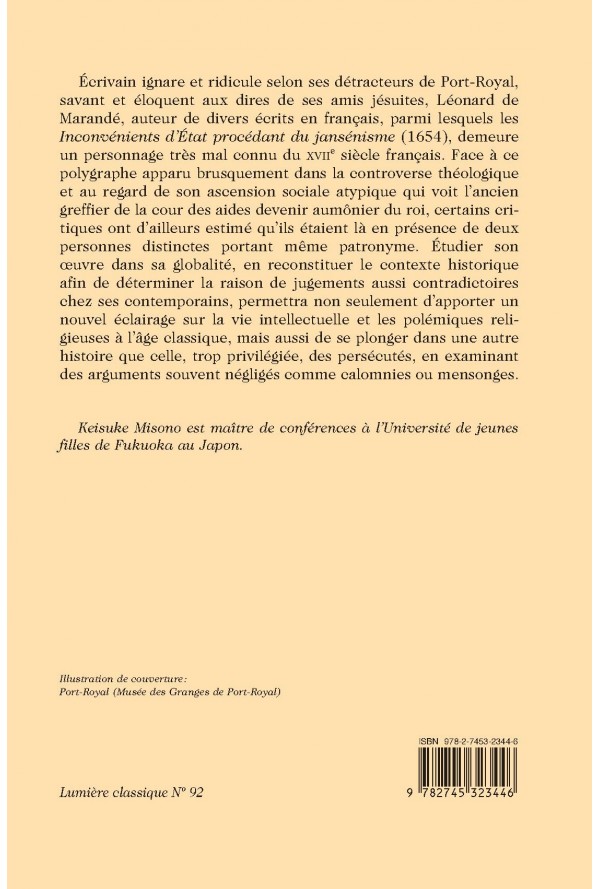 Écrivain ignare et ridicule selon ses détracteurs de Port-Royal, savant et éloquent aux dires de ses amis jésuites, Léonard de Marandé, auteur de divers écrits en français, parmi lesquels les Inconvénients d’État procédant du jansénisme (1654), demeure un personnage très mal connu du XVIIe siècle français. Face à ce polygraphe apparu brusquement dans la controverse théologique et au regard de son ascension sociale atypique qui voit l’ancien greffier de la cour des aides devenir aumônier du roi, certains critiques ont d’ailleurs estimé qu’ils étaient là en présence de deux personnes distinctes portant même patronyme. Étudier son œuvre dans sa globalité, en reconstituer le contexte historique afin de déterminer la raison de jugements aussi contradictoires chez ses contemporains, permettra non seulement d’apporter un nouvel éclairage sur la vie intellectuelle et les polémiques religieuses à l’âge classique, mais aussi de se plonger dans une autre histoire que celle, trop privilégiée, des persécutés, en examinant des arguments souvent négligés comme calomnies ou mensonges. Keisuke Misono est maître de conférences à l’Université de jeunes filles de Fukuoka au Japon.