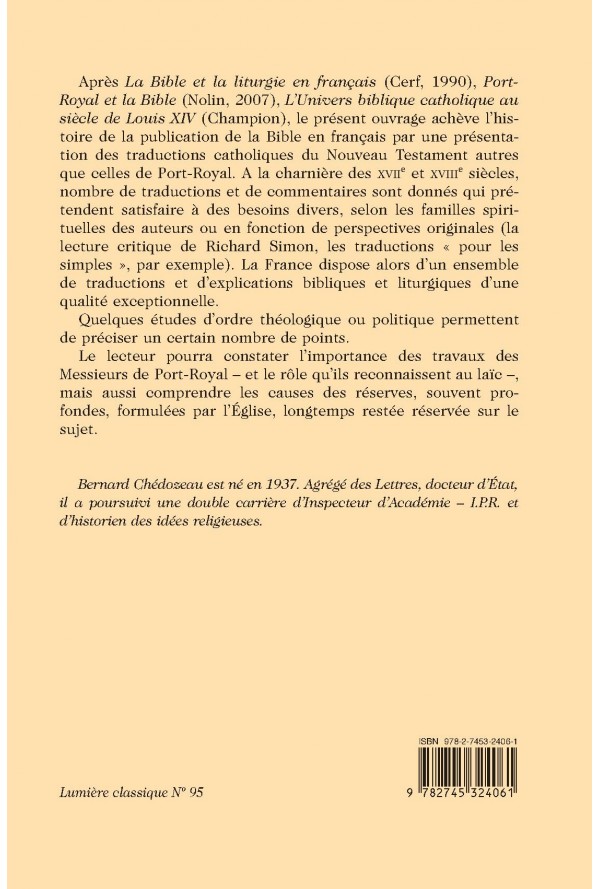 Après La Bible et la liturgie en français (Cerf, 1990), Port- Royal et la Bible (Nolin, 2007), L’Univers biblique catholique au siècle de Louis XIV (Champion), le présent ouvrage achève l’histoire de la publication de la Bible en français par une présentation des traductions catholiques du Nouveau Testament autres que celles de Port-Royal. A la charnière des XVIIe et XVIIIe siècles, nombre de traductions et de commentaires sont donnés qui prétendent satisfaire à des besoins divers, selon les familles spirituelles des auteurs ou en fonction de perspectives originales (la lecture critique de Richard Simon, les traductions « pour les simples », par exemple). La France dispose alors d’un ensemble de traductions et d’explications bibliques et liturgiques d’une qualité exceptionnelle. Quelques études d’ordre théologique ou politique permettent de préciser un certain nombre de points. Le lecteur pourra constater l’importance des travaux des Messieurs de Port-Royal – et le rôle qu’ils reconnaissent au laïc –, mais aussi comprendre les causes des réserves, souvent profondes, formulées par l’Église, longtemps restée réservée sur le sujet. Bernard Chédozeau est né en 1937. Agrégé des Lettres, docteur d’État, il a poursuivi une double carrière d’Inspecteur d’Académie – I.P.R. et d’historien des idées religieuses.