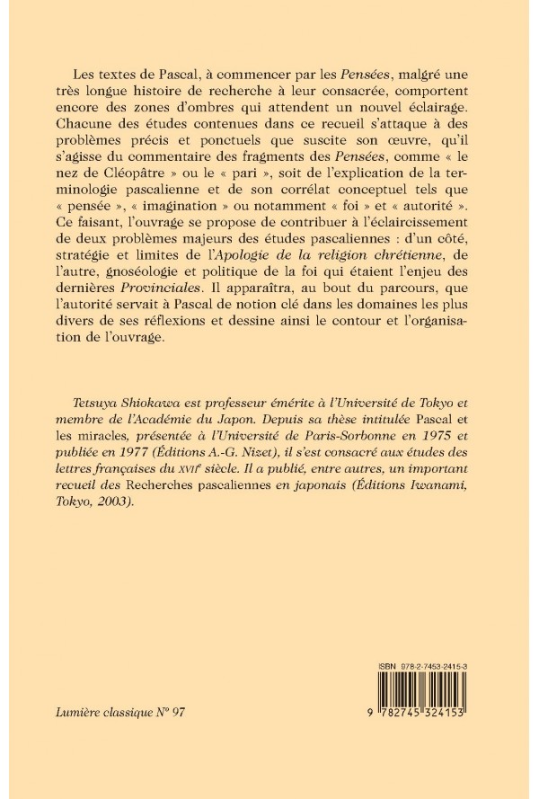Les textes de Pascal, à commencer par les Pensées, malgré une très longue histoire de recherche à leur consacrée, comportent encore des zones d’ombres qui attendent un nouvel éclairage. Chacune des études contenues dans ce recueil s’attaque à des problèmes précis et ponctuels que suscite son oeuvre, qu’il s’agisse du commentaire des fragments des Pensées, comme « le nez de Cléopâtre » ou le « pari », soit de l’explication de la terminologie pascalienne et de son corrélat conceptuel tels que « pensée », « imagination » ou notamment « foi » et « autorité ». Ce faisant, l’ouvrage se propose de contribuer à l’éclaircissement de deux problèmes majeurs des études pascaliennes : d’un côté, stratégie et limites de l’Apologie de la religion chrétienne, de l’autre, gnoséologie et politique de la foi qui étaient l’enjeu des dernières Provinciales. Il apparaîtra, au bout du parcours, que l’autorité servait à Pascal de notion clé dans les domaines les plus divers de ses réflexions et dessine ainsi le contour et l’organisation de l’ouvrage.
