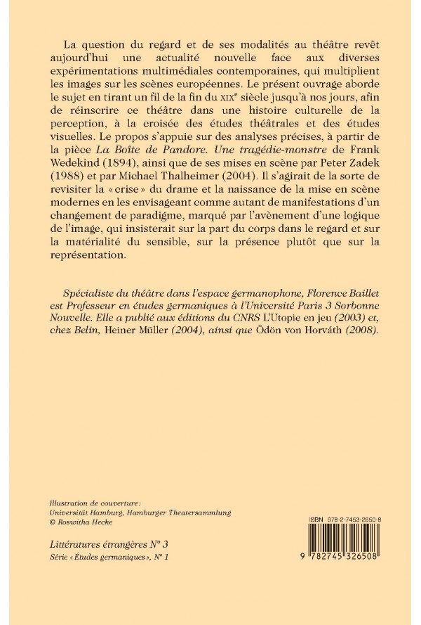 La question du regard et de ses modalités au théâtre revêt aujourd’hui une actualité nouvelle face aux diverses expérimentations multimédiales contemporaines, qui multiplient les images sur les scènes européennes. Le présent ouvrage aborde le sujet en tirant un fil de la fin du XIXe siècle jusqu’à nos jours, afin de réinscrire ce théâtre dans une histoire culturelle de la perception, à la croisée des études théâtrales et des études visuelles. Le propos s’appuie sur des analyses précises, à partir de la pièce « La Boîte de Pandore. Une tragédie-monstre » de Frank Wedekind (1894), ainsi que de ses mises en scène par Peter Zadek (1988) et par Michael Thalheimer (2004). Il s’agirait de la sorte de revisiter la « crise » du drame et la naissance de la mise en scène modernes en les envisageant comme autant de manifestations d’un changement de paradigme, marqué par l’avènement d’une logique de l’image, qui insisterait sur la part du corps dans le regard et sur la matérialité du sensible, sur la présence plutôt que sur la représentation.