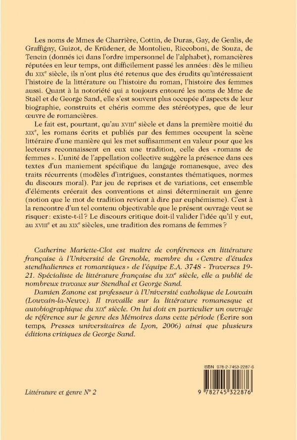 Les noms de Mmes de Charrière, Cottin, de Duras, Gay, de Genlis, de Graffigny, Guizot, de Krüdener, de Montolieu, Riccoboni, de Souza, de Tencin (donnés ici dans l’ordre impersonnel de l’alphabet), romancières réputées en leur temps, ont difficilement passé les années : dès le milieu du XIXe siècle, ils n’ont plus été retenus que des érudits qu’intéressaient l’histoire de la littérature ou l’histoire du roman, l’histoire des femmes aussi. Quant à la notoriété qui a toujours entouré les noms de Mme de Staël et de George Sand, elle s’est souvent plus occupée d’aspects de leur biographie, construits et chéris comme des stéréotypes, que de leur oeuvre de romancières. Le fait est, pourtant, qu’au XVIIIe siècle et dans la première moitié du XIXe, les romans écrits et publiés par des femmes occupent la scène littéraire d’une manière qui les met suffisamment en valeur pour que les lecteurs reconnaissent en eux une tradition, celle des « romans de femmes». L’unité de l’appellation collective suggère la présence dans ces textes d’un maniement spécifique du langage romanesque, avec des traits récurrents (modèles d’intrigues, constantes thématiques, normes du discours moral). Par jeu de reprises et de variations, cet ensemble d’éléments créerait des conventions et ainsi déterminerait un genre (notion que le mot de tradition revient à dire par euphémisme). C’est à la rencontre d’un tel contenu objectivable que le présent ouvrage veut se risquer : existe-t-il ? Le discours critique doit-il valider l’idée qu’il y eut, au XVIIIe et au XIXe siècles, une tradition des romans de femmes?