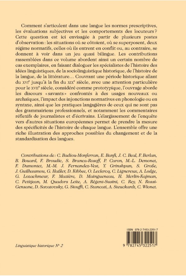 Comment s`articulent dans une langue les normes prescriptives, les évaluations subjectives et les comportements des locuteurs? Cette question est ici envisagée à partir de plusieurs postes d`observation : les situations où se côtoient, où se superposent, deux régime normatifs, celles où ils entrent en conflit ou, au contraire, se donnent à voir dans un jeu quasi bilingue. Les contributions rassemblées dans ce volume abordent ainsi un certain nombre de cas exemplaires, en faisant dialoguer les spécialistes de l`histoire des idées linguistiques, de la sociolinguistique historique, de l`histoire de la langue, de la littérature… Couvrant une période historique allant du XVIe jusqu`à la fin du XIXe siècle, avec une attention particulière pour le XVIIe siècle, considéré comme prototypique, l`ouvrage aborde les discours "savants" confrontés à des usages nouveaux ou archaïques, l`impact des injonctions normatives en phonologie ou en syntaxe, ainsi que les pratiques langagières de ceux qui ne sont pas des grammairiens professionnels, et notamment les commentaires réflexifs de journalistes et d`écrivains. L`élargissement de l`enquête vers d`autres situations européennes permet de prendre la mesure des spécificités de l`histoire de chaque langue. L`ensemble offre une riche illustration des approches possibles du changement et de la standardisation des langues. Contributions de: C. Badiou-Monferran, E. Banfi, J. C. Beal, F. Berlan, B. Bouard, F. Broudic, S. Branca-Rosoff, P. Caron, M.-L. Demonet, F. Dumontet, M.-M. J. Fernandez-Vest, Y. Grinshpun, S. Große, J. Guilhaumou, G. Haßler, D. Kibbee, O. Leclercq, C. Lignereux, A. Lodge, G. Lozachmeur, F. Mazière, D. Maingueneau, H. Merlin-Kajman, C. Petitjean, M. Quadors Leite, A. Régent-Susini, C. Rey, N. Rossi- Gensane, D. Savatovsky, G. Siouffi, C. Stancati, A. Steuckardt, C. Wionet