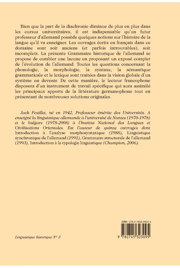 Bien que la part de la diachronie diminue de plus en plus dans les cursus universitaires, il est indispensable qu’un futur professeur d’allemand possède quelques notions sur l’histoire de la langue qu’il va enseigner. Les ouvrages écrits en français dans ce domaine sont soit anciens (et parfois introuvables), soit incomplets. La présente Grammaire historique de l’allemand se propose de combler une lacune en proposant un exposé complet de l’évolution de l’allemand. Toutes les questions concernant la phonologie, la morphologie, la syntaxe, la sémantique grammaticale et le lexique sont traitées dans la vision globale d’un système en devenir. De cette manière, le lecteur francophone disposera d’un instrument de travail spécifique qui aura assimilé les principaux apports de la littérature germanophone tout en présentant de nombreuses solutions originales. Jack Feuillet, né en 1942, Professeur émérite des Universités. A enseigné la linguistique allemande à l’université de Nantes (1970-1978) et le bulgare (1978-2008) à l’Institut National des Langues et Civilisations Orientales. Est l’auteur de quinze ouvrages dont Introduction à l’analyse morphosyntaxique (1988), Linguistique synchronique de l’allemand (1991), Grammaire structurale de l’allemand (1993), Introduction à la typologie linguistique (Champion, 2006).