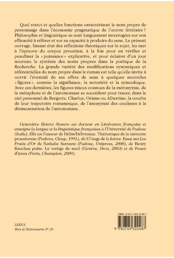 Quel statut et quelles fonctions caractérisent le nom propre de personnage dans l`économie pragmatique de l`œuvre littéraire? Philosophie et linguistique se sont longuement interrogées sur son efficacité à référer et sur sa capacité à produire du sens. Le présent ouvrage, faisant état des réflexions théoriques sur le sujet, les met à l`épreuve du corpus proustien, à la fois pour en vérifier et peaufiner la "puissance " explicative, et pour éclairer d`un jour nouveau le système des noms propres dans la poétique de la Recherche. La grande variété des modifications syntaxiques et référentielles du nom propre dans le roman est telle qu`elle invite à ouvrir l`éventail de ses effets de sens à quelques nouvelles " figures ", comme la signifiance, la notoriété et la synecdoque. Avec ces dernières, les figures mieux connues de la métonymie, de la métaphore et de l`antonomase se succèdent pour tracer, dans le ciel personnel de Bergotte, Charlus, Oriane ou Albertine, la courbe de leur trajectoire romanesque, de l`anonymat des coulisses à la désincarnation de l`antonomase. Geneviève Henrot Sòstero est docteur en Littérature française et enseigne la langue et la linguistique françaises à l`Université de Padoue (Italie). Elle est l`auteur de Délits/Délivrance. Thématique de la mémoire proustienne (Padova, Cleup, 1991), de L`Usage de la forme. Essai sur Les Fruits d`Or de Nathalie Sarraute (Padoue, Unipress, 2000), de Henry Bauchau poète. Le vertige du seuil (Genève, Droz, 2003) et de Peaux d`âmes (Paris, Champion, 2009).