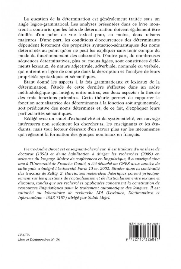 La question de la détermination est généralement traitée sous un angle logico-grammatical. Les analyses présentées dans ce livre montrent a contrario que les faits de détermination doivent également être étudiés d`un point de vue lexical pour, au moins, deux raisons majeures. D`une part, les conditions d`occurrences des déterminants dépendent fortement des propriétés syntactico-sémantiques des noms déterminés au point qu`on ne peut les expliquer sans tenir compte du mode de fonctionnement des substantifs. D`autre part, de nombreuses séquences déterminatives, plus ou moins figées, sont constituées d`éléments lexicaux, de nature adjectivale, adverbiale, nominale ou verbale, qui entrent en ligne de compte dans la description et l`analyse de leurs propriétés syntaxiques et sémantiques. Étant donné les aspects à la fois grammaticaux et lexicaux de la détermination, l’étude de cette dernière s`effectue dans un cadre méthodologique qui intègre, entre autres, ces deux aspects : la théorie des trois fonctions primaires. Cette théorie permet de rapporter la fonction actualisatrice des déterminants à la fonction soit argumentale, soit prédicative des noms déterminés et, de ce fait, d`expliquer leurs particularités sémantiques. Rédigé avec un souci d`exhaustivité et de systématicité, cet ouvrage intéressera non seulement les chercheurs, les enseignants et les étudiants, mais tout lecteur désireux d`en savoir plus sur les mécanismes qui régissent la formation des groupes nominaux en français.