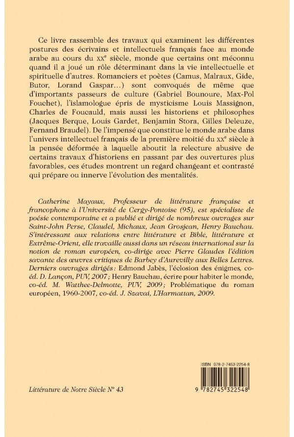 Ce livre rassemble des travaux qui examinent les différentes postures des écrivains et intellectuels français face au monde arabe au cours du XXe siècle, monde que certains ont méconnu quand il a joué un rôle déterminant dans la vie intellectuelle et spirituelle d`autres. Romanciers et poètes (Camus, Malraux, Gide, Butor, Lorand Gaspar…) sont convoqués de même que d`importants passeurs de culture (Gabriel Bounoure, Max-Pol Fouchet), l`islamologue épris de mysticisme Louis Massignon, Charles de Foucauld, mais aussi les historiens et philosophes (Jacques Berque, Louis Gardet, Benjamin Stora, Gilles Deleuze, Fernand Braudel). De l`impensé que constitue le monde arabe dans l`univers intellectuel français de la première moitié du XXe siècle à la pensée déformée à laquelle aboutit la relecture abusive de certains travaux d`historiens en passant par des ouvertures plus favorables, ces études montrent un regard changeant et contrasté qui prépare ou innerve l`évolution des mentalités. Catherine Mayaux, Professeur de littérature française et francophone à l`Université de Cergy-Pontoise (95), est spécialiste de poésie contemporaine et a publié et dirigé de nombreux ouvrages sur Saint-John Perse, Claudel, Michaux, Jean Grosjean, Henry Bauchau. S`intéressant aux relations entre littérature et Bible, littérature et Extrême-Orient, elle travaille aussi dans un réseau international sur la notion de roman européen, co-dirige avec Pierre Glaudes l`édition savante des œuvres critiques de Barbey d`Aurevilly aux Belles Lettres. Derniers ouvrages dirigés : Edmond Jabès, l`éclosion des énigmes, co-éd. D. Lançon, PUV, 2007 ; Henry Bauchau, écrire pour habiter le monde, co-éd. M. Watthee-Delmotte, PUV, 2009; Problématique du roman européen, 1960-2007, co-éd. J. Szavai, L`Harmattan, 2009.
