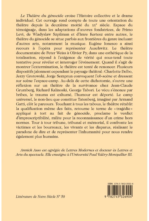 « Le Théâtre du génocide » croise l’Histoire collective et le drame individuel. Cet ouvrage rend compte de toute une orientation du théâtre depuis la deuxième moitié du XXe siècle. Espace du témoignage, dans les adaptations d’œuvres fondatrices, de Primo Levi, de Wladyslaw Szpilman et d’Imre Kertesz entre autres, le théâtre du génocide se situe parfois aux frontières du genre incluant d’autres arts, notamment la musique. Eugène Ionesco a ainsi recours à l’opéra pour représenter Auschwitz. Le théâtre documentaire de Peter Weiss à Olivier Py, dans une esthétique de la totalisation, répond à l’exigence de vérité qui sous-tend toute tentative pour révéler et interroger l’événement. Quand il s’agit de montrer l’extermination, le théâtre est tenté de renoncer. Plusieurs dispositifs jalonnent cependant le paysage théâtral : Charlotte Delbo, Jerzy Grotowski, Jorge Semprun convoquent l’ob-scène et dressent sur scène l’espace-camp. Au-delà de cette dichotomie, s’ouvre une réflexion sur un théâtre de la survivance chez Jean-Claude Grumberg, Richard Kalinoski, George Tabori. Le vécu s’énonce par bribes, le trauma est exhumé, l’humour est déporté. Le camp universel, le non-lieu que constitue Tatenberg, imaginé par Armand Gatti, clôt le parcours. Touchant à tous les tabous, le théâtre rétablit la qualification même des faits, retourne le terme de « tragédie» appliqué à tort au fait de génocide, proclame le verdict d’imprescriptibilité, milite pour la reconnaissance d’un crime hors normes. Tour à tour tribune, tribunal et mémorial, il confronte les victimes et les bourreaux, les vivants et les disparus, réalisant le paradoxe de dire et de représenter l’inhumanité pour nous rendre également plus humains.