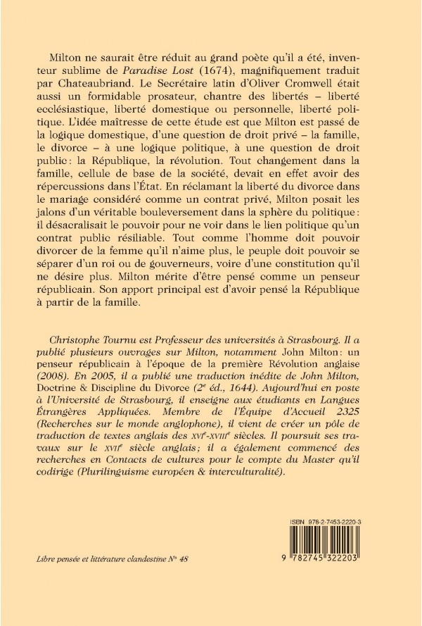 Milton ne saurait être réduit au grand poète qu`il a été, inventeur sublime de Paradise Lost (1674), magnifiquement traduit par Chateaubriand. Le Secrétaire latin d`Oliver Cromwell était aussi un formidable prosateur, chantre des libertés - liberté ecclésiastique, liberté domestique ou personnelle, liberté politique. L`idée maîtresse de cette étude est que Milton est passé de la logique domestique, d`une question de droit privé - la famille, le divorce - à une logique politique, à une question de droit public : la République, la révolution. Tout changement dans la famille, cellule de base de la société, devait en effet avoir des répercussions dans l`État. En réclamant la liberté du divorce dans le mariage considéré comme un contrat privé, Milton posait les jalons d`un véritable bouleversement dans la sphère du politique : il désacralisait le pouvoir pour ne voir dans le lien politique qu`un contrat public résiliable. Tout comme l`homme doit pouvoir divorcer de la femme qu`il n`aime plus, le peuple doit pouvoir se séparer d`un roi ou de gouverneurs, voire d`une constitution qu`il ne désire plus. Milton mérite d`être pensé comme un penseur républicain. Son apport principal est d`avoir pensé la République à partir de la famille.