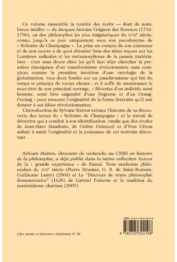 Ce volume rassemble la totalité des écrits — dont de nombreux inédits — de Jacques-Antoine Grignon des Bureaux (1714- 1796), un des philosophes les plus énigmatiques du XVIIIe siècle, connu jusqu’à ce jour uniquement sous son pseudonyme de « Solitaire de Champagne ». La prise en compte de son existence et de son œuvre a de quoi ébranler bien des idées reçues sur les Lumières radicales et les métamorphoses de la pensée matérialiste : c’est sans doute chez lui qu’il faut aller chercher la première émergence d’un transformisme évolutionniste sans complexe comme la première intuition d’une ontologie de la globalisation, tous deux fondés sur un panchronisme qui fait du temps le principe de toutes choses ; et il suffit de mentionner le sous-titre de son principal ouvrage, « Rêveries d’un individu semi homme, semi bête engendré d’une Négresse et d’un Orang- Outang » pour mesurer l’originalité de la forme littéraire qu’il sait donner à ses idées révolutionnaires. L’introduction de Sylvain Matton retrace l’histoire de sa découverte des textes du « Solitaire de Champagne » et le travail de détective qui a conduit à son identification, tandis que des études de Jean-Marc Mandosio, de Cédric Grimoult et d’Yves Citton aident à saisir l’originalité et la puissance de cet écrivain déroutant.