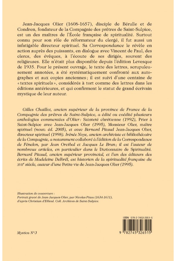 Gilles Chaillot, ancien supérieur de la province de France de la Compagnie des prêtres de Saint-Sulpice, a édité ou coédité plusieurs anthologies commentées d’Olier : Sainteté chrétienne (1992), Prier à Saint-Sulpice avec Jean-Jacques Olier (1995), Monsieur Olier, maître spirituel (nouv. éd. 2005), et avec Bernard Pitaud Jean-Jacques Olier, directeur spirituel (1998). Irénée Noye, ancien archiviste et bibliothécaire de la Compagnie, a notamment collaboré à l’édition de la Correspondance de Fénelon, par Jean Orcibal et Jacques Le Brun; il est l’auteur de nombreux articles, en particulier dans le Dictionnaire de Spiritualité. Bernard Pitaud, ancien supérieur provincial, et l’un des éditeurs des écrits de Madeleine Delbrêl, est historien de la spiritualité française du XVIIe siècle, auteur d’une Petite vie de Jean-Jacques Olier (1995).