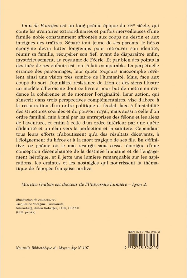 Lion de Bourges est un long poème épique du XIVe siècle, qui conte les aventures extraordinaires et parfois merveilleuses d’une famille noble constamment affrontée aux coups du destin et aux intrigues des traîtres. Séparé tout jeune de ses parents, le héros éponyme devra lutter longtemps pour retrouver son identité, réunir sa famille, récupérer son fief, avant de disparaître enfin, mystérieusement, au royaume de Féerie. Et par bien des points la destinée de ses enfants est tout à fait comparable. La perpétuelle errance des personnages, leur quête toujours inaccomplie révèlent ainsi une vision très sombre de l’humanité. Mais, face aux coups du sort, l’opiniâtre résistance de Lion et des siens illustre un modèle d’héroïsme dont ce livre a pour but de mettre en évidence la cohérence et de montrer l’originalité. Leur action, qui s’inscrit dans trois perspectives complémentaires, vise d’abord à la restauration d’un ordre politique et féodal, face à l’instabilité des structures sociales et du pouvoir royal, mais aussi à celle d’un ordre familial, mis à mal par les entreprises des félons et les aléas de l’aventure, et enfin à celle d’un ordre intérieur par une quête d’identité et un élan vers la perfection et la sainteté. Cependant tous leurs efforts n’aboutissent qu’à des résultats décevants, à l’éloignement du héros et à la mort tragique de ses fils. En définitive, ce poème où le mal resurgit sans cesse témoigne d’une conception désenchantée de la destinée humaine et de l’engagement héroïque, et il jette une lumière remarquable sur les aspirations, les craintes et les nostalgies qui nourrissent la thématique de l’épopée française tardive.