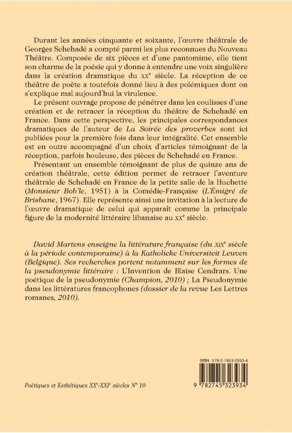 Durant les années cinquante et soixante, l’œuvre théâtrale de Georges Schehadé a compté parmi les plus reconnues du Nouveau Théâtre. Composée de six pièces et d’une pantomime, elle tient son charme de la poésie qui y donne à entendre une voix singulière dans la création dramatique du XXe siècle. La réception de ce théâtre de poète a toutefois donné lieu à des polémiques dont on s’explique mal aujourd’hui la virulence. Le présent ouvrage propose de pénétrer dans les coulisses d’une création et de retracer la réception du théâtre de Schehadé en France. Dans cette perspective, les principales correspondances dramatiques de l’auteur de La Soirée des proverbes sont ici publiées pour la première fois dans leur intégralité. Cet ensemble est en outre accompagné d’un choix d’articles témoignant de la réception, parfois houleuse, des pièces de Schehadé en France. Présentant un ensemble témoignant de plus de quinze ans de création théâtrale, cette édition permet de retracer l’aventure théâtrale de Schehadé en France de la petite salle de la Huchette (Monsieur Bob’le, 1951) à la Comédie-Française (L’Émigré de Brisbane, 1967). Elle représente ainsi une invitation à la lecture de l’oeuvre dramatique de celui qui apparaît comme la principale figure de la modernité littéraire libanaise au XXe siècle. David Martens enseigne la littérature française (du XIXe siècle à la période contemporaine) à la Katholieke Universiteit Leuven (Belgique). Ses recherches portent notamment sur les formes de la pseudonymie littéraire : L’Invention de Blaise Cendrars. Une poétique de la pseudonymie (Champion, 2010) ; La Pseudonymie dans les littératures francophones (dossier de la revue Les Lettres romanes, 2010).