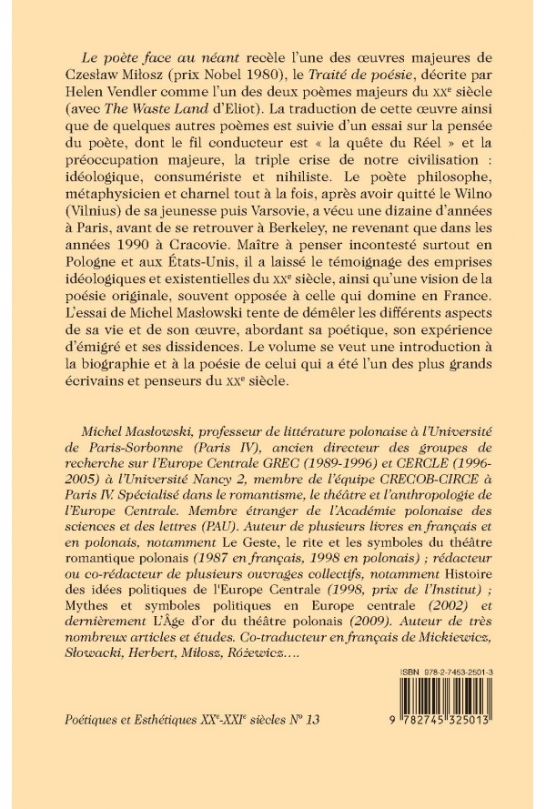 « Le poète face au néant » recèle l’une des œuvres majeures de Czeslaw Milosz (prix Nobel 1980), le Traité de poésie, décrite par Helen Vendler comme l’un des deux poèmes majeurs du XXe siècle (avec « The Waste Land » d’Eliot). La traduction de cette œuvre ainsi que de quelques autres poèmes est suivie d’un essai sur la pensée du poète, dont le fil conducteur est « la quête du Réel » et la préoccupation majeure, la triple crise de notre civilisation : idéologique, consumériste et nihiliste. Le poète philosophique, métaphysique et charnel tout à la fois, après avoir quitté le Wilno (Vilnius) de sa jeunesse puis Varsovie, a vécu une dizaine d’années à Paris, avant de se retrouver à Berkeley, ne revenant que dans les années 1990 à Cracovie. Maître à penser incontesté surtout en Pologne et aux États-Unis, il a laissé le témoignage des emprises idéologiques et existentielles du XXe siècle, ainsi qu’une vision de la poésie originale, souvent opposée à celle qui domine en France. L’essai de Michel Maslowski tente de démêler les différents aspects de sa vie et de son œuvre, abordant sa poétique, son expérience d’émigré et ses dissidences. Le volume se veut une introduction à la biographie et à la poésie de celui qui a été l’un des plus grands écrivains et penseurs du XXe siècle.
