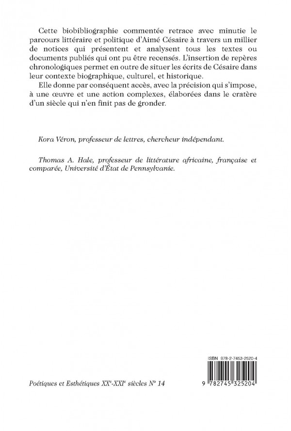 Cette biobibliographie commentée retrace avec minutie le parcours littéraire et politique d’Aimé Césaire à travers un millier de notices qui présentent et analysent tous les textes ou documents publiés qui ont pu être recensés. L’insertion de repères chronologiques permet en outre de situer les écrits de Césaire dans leur contexte biographique, culturel, et historique. Elle donne par conséquent accès, avec la précision qui s’impose, à une œuvre et une action complexes, élaborées dans le cratère d’un siècle qui n’en finit pas de gronder.
