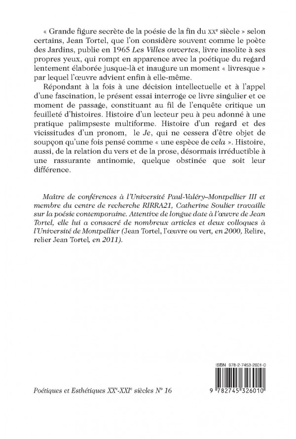 « Grande figure secrète de la poésie de la fin du XXe siècle » selon certains, Jean Tortel, que l’on considère souvent comme le poète des Jardins, publie en 1965 Les « Villes ouvertes », livre insolite à ses propres yeux, qui rompt en apparence avec la poétique du regard lentement élaborée jusque-là et inaugure un moment « livresque » par lequel l’œuvre advient enfin à elle-même. Répondant à la fois à une décision intellectuelle et à l’appel d’une fascination, le présent essai interroge ce livre singulier et ce moment de passage, constituant au fil de l’enquête critique un feuilleté d’histoires. Histoire d’un lecteur peu à peu adonné à une pratique palimpseste multiforme. Histoire d’un regard et des vicissitudes d’un pronom, le Je, qui ne cessera d’être objet de soupçon qu’une fois pensé comme « une espèce de cela ». Histoire, aussi, de la relation du vers et de la prose, désormais irréductible à une rassurante antinomie, quelque obstinée que soit leur différence.