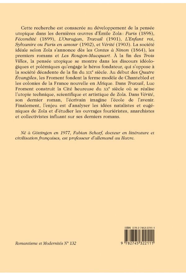 Cette recherche est consacrée au développement de la pensée utopique dans les dernières œuvres d`Émile Zola : Paris (1898), Fécondité (1899), L`Ouragan, Travail (1901), L`Enfant roi, Sylvanire ou Paris en amour (1902), et Vérité (1903). La société idéale selon Zola s`annonce dès les Contes à Ninon (1864), les premiers romans et Les Rougon-Macquart. À la fin des Trois Villes, la pensée utopique se montre dans les discours idéologiques et polémiques qu`engage le héros fondateur, qui s`oppose à la société décadente de la fin du XIXe siècle. Au début des Quatre Évangiles, les Froment fondent la ferme modèle de Chantebled et les colonies de la France nouvelle en Afrique. Dans Travail, Luc Froment construit la Cité heureuse du XXe siècle où se réalise l`utopie technique, scientifique et artistique de Zola. Dans Vérité, son dernier roman, l`écrivain imagine l`école de l`avenir. Finalement, l`enjeu est d`analyser les idées natalistes et eugéniques de Zola et d`étudier les ouvrages fouriéristes, anarchistes et collectivistes influant sur ses derniers romans. Né à Göttingen en 1977, Fabian Scharf, docteur en littérature et civilisation françaises, est professeur d`allemand au Havre.
