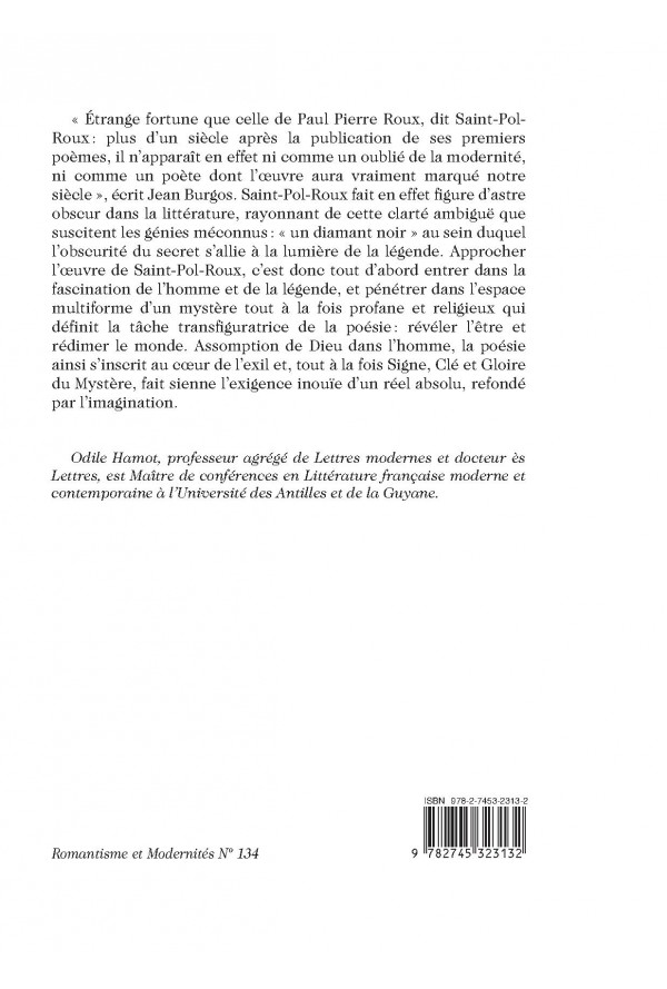 « Étrange fortune que celle de Paul Pierre Roux, dit Saint-Pol-Roux: plus d’un siècle après la publication de ses premiers poèmes, il n’apparaît en effet ni comme un oublié de la modernité, ni comme un poète dont l’œuvre aura vraiment marqué notre siècle », écrit Jean Burgos. Saint-Pol-Roux fait en effet figure d’astre obscur dans la littérature, rayonnant de cette clarté ambiguë que suscitent les génies méconnus : « un diamant noir » au sein duquel l’obscurité du secret s’allie à la lumière de la légende. Approcher l’œuvre de Saint-Pol-Roux, c’est donc tout d’abord entrer dans la fascination de l’homme et de la légende, et pénétrer dans l’espace multiforme d’un mystère tout à la fois profane et religieux qui définit la tâche transfiguratrice de la poésie : révéler l’être et rédimer le monde. Assomption de Dieu dans l’homme, la poésie ainsi s’inscrit au cœur de l’exil et, tout à la fois Signe, Clé et Gloire du Mystère, fait sienne l’exigence inouïe d’un réel absolu, refondé par l’imagination.