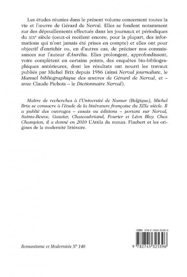 Les études réunies dans le présent volume concernent toutes la vie et l’oeuvre de Gérard de Nerval. Elles se fondent notamment sur des dépouillements effectués dans les journaux et périodiques du XIXe siècle (ceux-ci recèlent encore, pour la plupart, des informations qui n’ont jamais été prises en compte) et elles ont pour objectif d’enrichir ou, en d’autres cas, de préciser nos connaissances sur l’auteur d’Aurélia. Elles prolongent, approfondissent, voire complètent en certains points, des enquêtes bio-bibliographiques antérieures, dont les résultats ont nourri les travaux publiés par Michel Brix depuis 1986 (ainsi Nerval journaliste, le Manuel bibliographique des œuvres de Gérard de Nerval, et – avec Claude Pichois – le Dictionnaire Nerval).