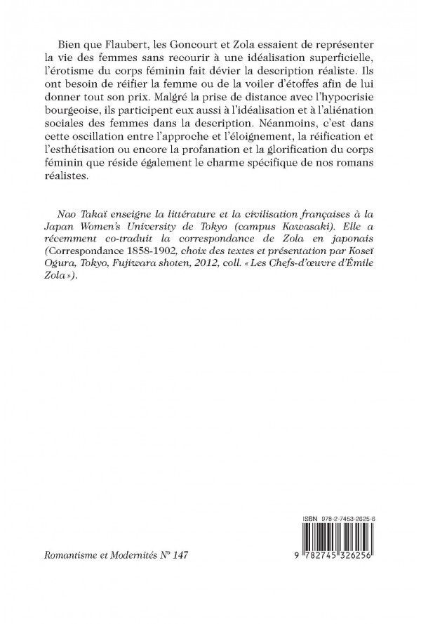 Bien que Flaubert, les frères Goncourt et Zola essaient de représenter la vie des femmes sans recourir à une idéalisation superficielle, l’érotisme du corps féminin dévie la description réaliste. Ils ont besoin de réifier la femme ou de la voiler d’étoffes afin de lui donner tout son prix. Malgré la prise de distance avec l’hypocrisie bourgeoise, ils participent eux aussi à l’idéalisation et à l’aliénation sociales des femmes dans la description. Néanmoins, c’est dans cette oscillation entre l’approche et l’éloignement, la réification et l’esthétisation ou encore la profanation et la glorification du corps féminin que réside également le charme spécifique de nos romans réalistes.