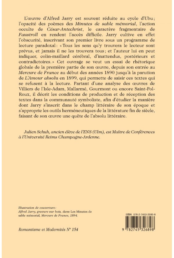 L’œuvre d’Alfred Jarry est souvent réduite au cycle d’Ubu ; l’opacité des poèmes des Minutes de sable mémorial, l’action occulte de César-Antechrist, le caractère fragmentaire de Faustroll en rendent l’accès difficile. Jarry cultive en effet l’obscurité, inscrivant son premier livre sous un programme de lecture paradoxal : «Tous les sens qu’y trouvera le lecteur sont prévus, et jamais il ne les trouvera tous ; et l’auteur lui en peut indiquer, colin-maillard cérébral, d’inattendus, postérieurs et contradictoires. » Cet ouvrage se veut un essai de rhétorique globale de la première partie de son œuvre, depuis son entrée au Mercure de France au début des années 1890 jusqu’à la parution de L’Amour absolu en 1899, qui permette de saisir ces textes qui se refusent à la lecture. Partant d’une analyse des œuvres de Villiers de l’Isle-Adam, Mallarmé, Gourmont ou encore Saint-Pol-Roux, il décrit les conditions de production et de réception des textes dans la communauté symboliste, afin d’étudier la manière dont Jarry s’inscrit dans le champ littéraire de son époque et s’approprie les outils herméneutiques de la littérature fin de siècle, faisant de son œuvre une quête de l’absolu littéraire.