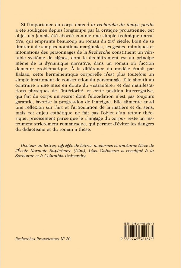 Si l`importance du corps dans À la recherche du temps perdu a été soulignée depuis longtemps par la critique proustienne, cet objet n`a jamais été abordé comme une simple technique narrative, qui emprunte beaucoup au roman du XIXe siècle. Loin de se limiter à de simples notations marginales, les gestes, mimiques et intonations des personnages de la Recherche constituent un véritable système de signes, dont le déchiffrement est au principe même de la dynamique narrative, dans un roman où l`action demeure problématique. À la différence du modèle établi par Balzac, cette herméneutique corporelle n`est plus toutefois un simple instrument de construction du personnage. Elle aboutit au contraire à une mise en doute du " caractère " et des manifestations physiques de l`intériorité, et cette position interrogative, qui fait du corps un secret dont l`élucidation n`est pas toujours garantie, favorise la progression de l`intrigue. Elle alimente aussi une réflexion sur l`art et l`articulation de la matière et du sens, mais cet enjeu esthétique ne fait pas l`objet d`un retour théorique, précisément parce que le " langage du corps " reste un instrument strictement romanesque, qui permet d`éviter les dangers du didactisme et du roman à thèse. Docteur en lettres, agrégée de lettres modernes et ancienne élève de l`École Normale Supérieure (Ulm), Liza Gabaston a enseigné à la Sorbonne et à Columbia University.
