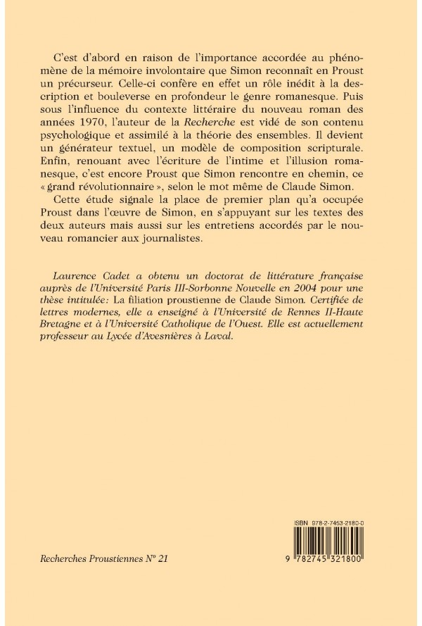 C`est d`abord en raison de l`importance accordée au phénomène de la mémoire involontaire que Simon reconnaît en Proust un précurseur. Celle-ci confère en effet un rôle inédit à la description et bouleverse en profondeur le genre romanesque. Puis sous l`influence du contexte littéraire du nouveau roman des années 1970, l`auteur de la Recherche est vidé de son contenu psychologique et assimilé à la théorie des ensembles. Il devient un générateur textuel, un modèle de composition scripturale. Enfin, renouant avec l`écriture de l`intime et l`illusion romanesque, c`est encore Proust que Simon rencontre en chemin, ce " grand révolutionnaire ", selon le mot même de Claude Simon. Cette étude signale la place de premier plan qu`a occupée Proust dans l`œuvre de Simon, en s`appuyant sur les textes des deux auteurs mais aussi sur les entretiens accordés par le nouveau romancier aux journalistes. Laurence Cadet a obtenu un doctorat de littérature française auprès de l`Université Paris III-Sorbonne Nouvelle en 2004 pour une thèse intitulée : La filiation proustienne de Claude Simon. Certifiée de lettres modernes, elle a enseigné à l`Université de Rennes II-Haute Bretagne et à l`Université Catholique de l`Ouest. Elle est actuellement professeur au Lycée d`Avesnières à Laval.