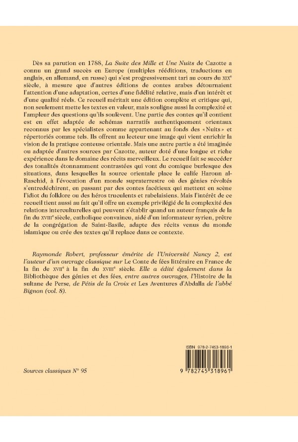 Dès sa parution en 1788, La Suite des Mille et Une Nuits de Cazotte a connu un grand succès en Europe (multiples rééditions, traductions en anglais, en allemand, en russe) qui s’est progressivement tari au cours du XIXe siècle, à mesure que d’autres éditions de contes arabes détournaient l’attention d’une adaptation, certes d’une fidélité relative, mais d’un intérêt et d’une qualité réels. Ce recueil méritait une édition complète et critique qui, non seulement mette les textes en valeur, mais souligne aussi la complexité et l’ampleur des questions qu’ils soulèvent. Une partie des contes qu’il contient est en effet adaptée de schémas narratifs authentiquement orientaux reconnus par les spécialistes comme appartenant au fonds des «Nuits » et répertoriés comme tels. Ils offrent au lecteur une image qui vient enrichir la vision de la pratique conteuse orientale. Mais une autre partie a été imaginée ou adaptée d’autres sources par Cazotte, auteur doté d’une longue et riche expérience dans le domaine des récits merveilleux. Le recueil fait se succéder des tonalités étonnamment contrastées qui vont du comique burlesque des situations, dans lesquelles la source orientale place le calife Haroun al- Raschid, à l’évocation d’un monde supraterrestre où des génies révoltés s’entredéchirent, en passant par des contes facétieux qui mettent en scène l’idiot du folklore ou des héros truculents et rabelaisiens. Mais l’intérêt de ce recueil tient aussi au fait qu’il offre un exemple privilégié de la complexité des relations interculturelles qui peuvent s’établir quand un auteur français de la fin du XVIIIe siècle, catholique convaincu, aidé d’un informateur syrien, prêtre de la congrégation de Saint-Basile, adapte des récits venus du monde islamique ou crée des textes qu’il replace dans ce contexte.