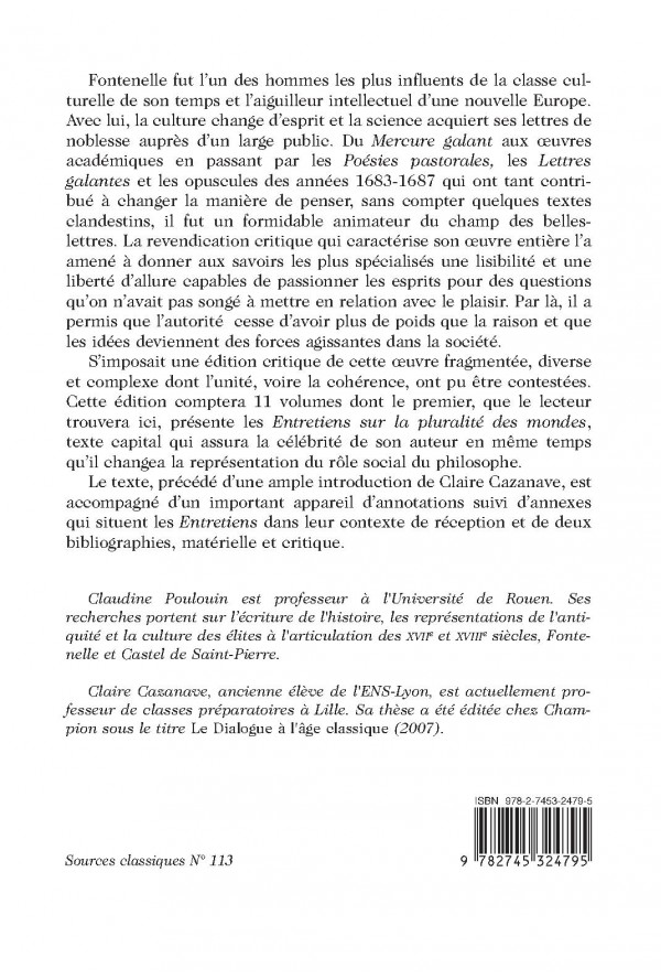 Fontenelle fut l’un des hommes les plus influents de la classe culturelle de son temps et l’aiguilleur intellectuel d’une nouvelle Europe. Avec lui, la culture change d’esprit et la science acquiert ses lettres de noblesse auprès d’un large public. Du « Mercure galant » aux œuvres académiques en passant par les « Poésies pastorales », les « Lettres galante »s et les opuscules des années 1683-1687 qui ont tant contribué à changer la manière de penser, sans compter quelques textes clandestins, il fut un formidable animateur du champ des belles-lettres. La revendication critique qui caractérise son œuvre entière l’a amené à donner aux savoirs les plus spécialisés une lisibilité et une liberté d’allure capables de passionner les esprits pour des questions qu’on n’avait pas songé à mettre en relation avec le plaisir. Par là, il a permis que l’autorité cesse d’avoir plus de poids que la raison et que les idées deviennent des forces agissantes dans la société. S’imposait une édition critique de cette œuvre fragmentée, diverse et complexe dont l’unité, voire la cohérence, ont pu être contestées. Cette édition comptera 11 volumes dont le premier, que le lecteur trouvera ici, présente les « Entretiens sur la pluralité des mondes », texte capital qui assura la célébrité de son auteur en même temps qu’il changea la représentation du rôle social du philosophe. Le texte, précédé d’une ample introduction de Claire Cazanave, est accompagné d’un important appareil d’annotations suivi d’annexes qui situent les « Entretiens » dans leur contexte de réception et de deux bibliographies, matérielle et critique.