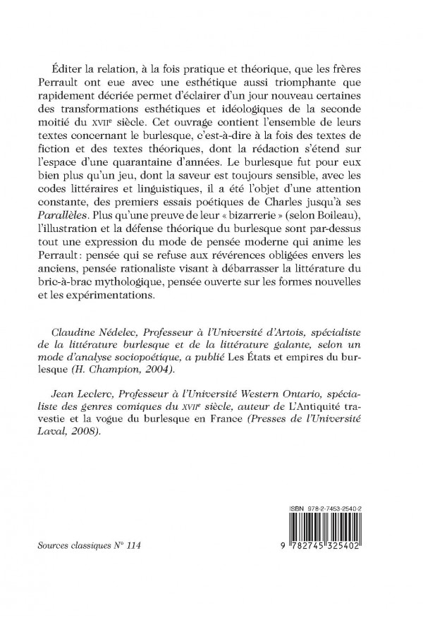 Éditer la relation, à la fois pratique et théorique, que les frères Perrault ont eue avec une esthétique aussi triomphante que rapidement décriée permet d’éclairer d’un jour nouveau certaines des transformations esthétiques et idéologiques de la seconde moitié du XVIIe siècle. Cet ouvrage contient l’ensemble de leurs textes concernant le burlesque, c’est-à-dire à la fois des textes de fiction et des textes théoriques, dont la rédaction s’étend sur l’espace d’une quarantaine d’années. Le burlesque fut pour eux bien plus qu’un jeu, dont la saveur est toujours sensible, avec les codes littéraires et linguistiques, il a été l’objet d’une attention constante, des premiers essais poétiques de Charles j jusqu’à ses Parallèles. Plus qu’une preuve de leur « bizarrerie » (selon Boileau), l’illustration et la défense théorique du burlesque sont par-dessus tout une expression du mode de pensée moderne qui anime les Perrault : pensée qui se refuse aux révérences obligées envers les anciens, pensée rationaliste visant à débarrasser la littérature du bric-à-brac mythologique, pensée ouverte sur les formes nouvelles et les expérimentations.