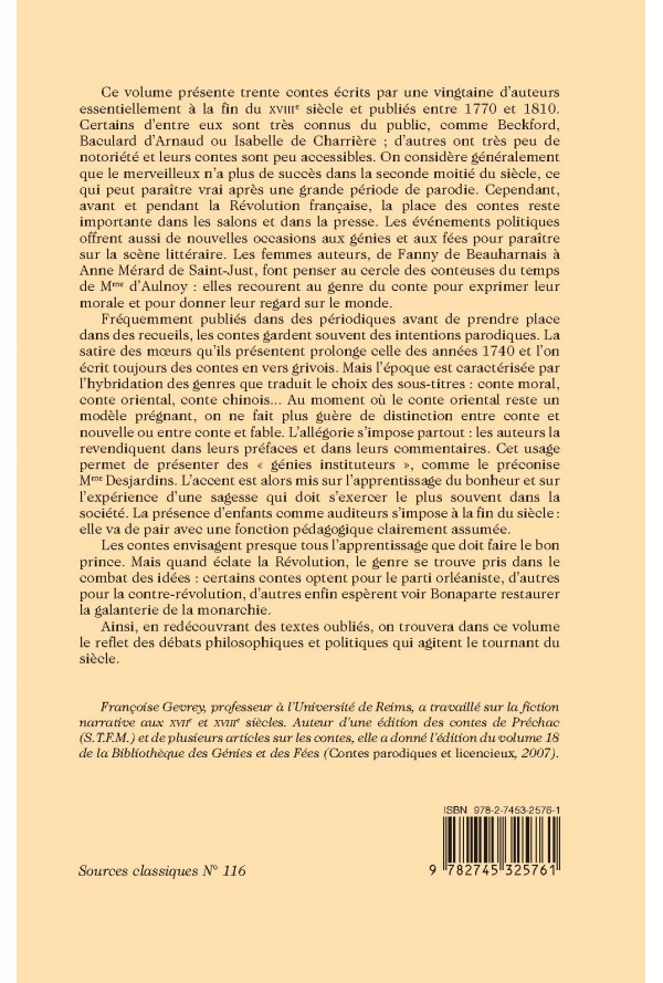 Ce volume présente trente contes écrits par une vingtaine d’auteurs essentiellement à la fin du XVIIIe siècle et publiés entre 1770 et 1810. Certains d’entre eux sont très connus du public, comme Beckford, Baculard d’Arnaud ou Isabelle de Charrière ; d’autres ont très peu de notoriété et leurs contes sont peu accessibles. On considère généralement que le merveilleux n’a plus de succès dans la seconde moitié du siècle, ce qui peut paraître vrai après une grande période de parodie. Cependant, avant et pendant la Révolution française, la place des contes reste importante dans les salons et dans la presse. Les événements politiques offrent aussi de nouvelles occasions aux génies et aux fées pour paraître sur la scène littéraire. Les femmes auteurs, de Fanny de Beauharnais à