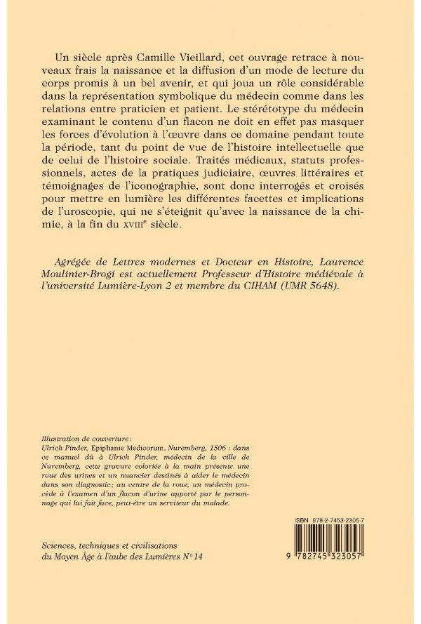 Un siècle après Camille Vieillard, cet ouvrage retrace à nouveaux frais la naissance et la diffusion d’un mode de lecture du corps promis à un bel avenir, et qui joua un rôle considérable dans la représentation symbolique du médecin comme dans les relations entre praticien et patient. Le stérétotype du médecin examinant le contenu d’un flacon ne doit en effet pas masquer les forces d’évolution à l’œuvre dans ce domaine pendant toute la période, tant du point de vue de l’histoire intellectuelle que de celui de l’histoire sociale. Traités médicaux, statuts professionnels, actes de la pratiques judiciaire, œuvres littéraires et témoignages de l’iconographie, sont donc interrogés et croisés pour mettre en lumière les différentes facettes et implications de l’uroscopie, qui ne s’éteignit qu’avec la naissance de la chimie, à la fin du XVIIIe siècle. Agrégée de Lettres modernes et Docteur en Histoire, Laurence Moulinier-Brogi est actuellement Professeur d’Histoire médiévale à l’université Lumière-Lyon 2 et membre du CIHAM (UMR 5648).