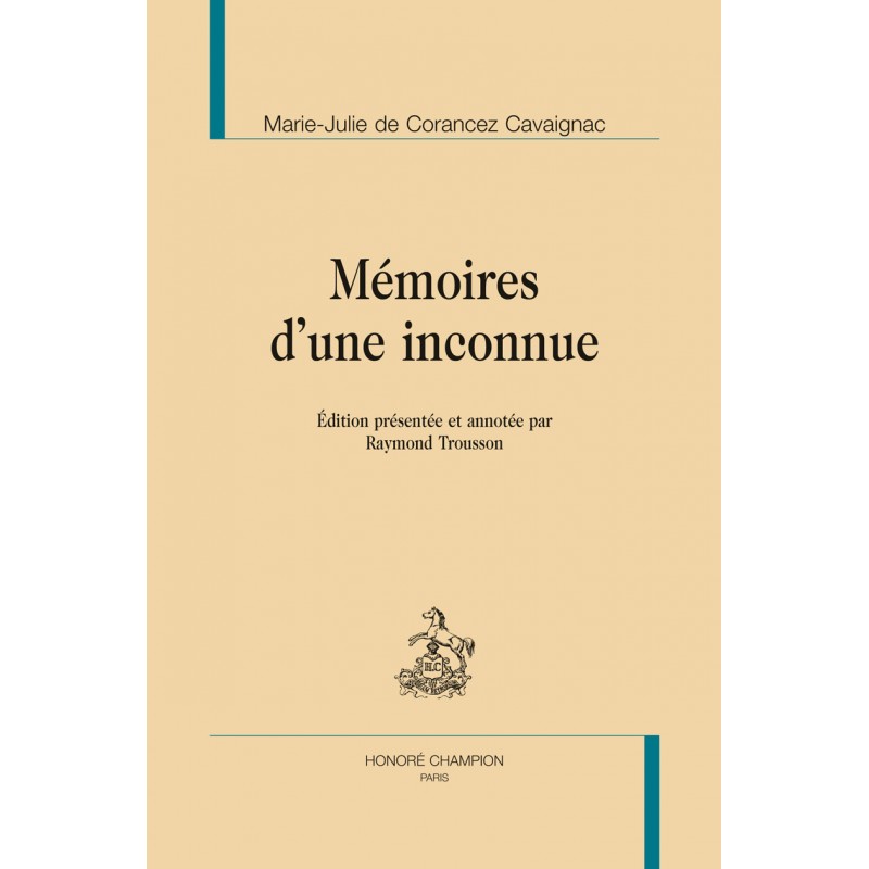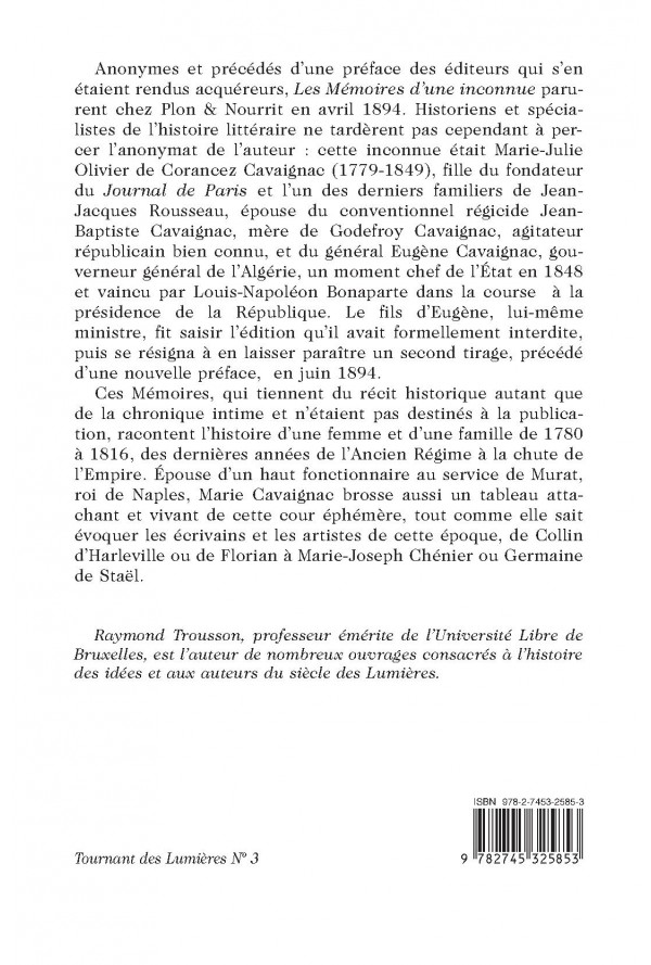 Anonymes et précédés d’une préface des éditeurs qui s’en étaient rendus acquéreurs, « Les Mémoires d’une inconnue » parurent chez Plon & Nourrit en avril 1894. Historiens et spécialistes de l’histoire littéraire ne tardèrent pas cependant à percer l’anonymat de l’auteur : cette inconnue était Marie-Julie Olivier de Corancez Cavaignac (1779-1849), fille du fondateur du « Journal de Paris » et l’un des derniers familiers de Jean-Jacques Rousseau, épouse du conventionnel régicide Jean-Baptiste Cavaignac, mère de Godefroy Cavaignac, agitateur républicain bien connu, et du général Eugène Cavaignac, gouverneur général de l’Algérie, un moment chef de l’État en 1848 et vaincu par Louis-Napoléon Bonaparte dans la course à la présidence de la République. Le fils d’Eugène, lui-même ministre, fit saisir l’édition qu’il avait formellement interdite, puis se résigna à en laisser paraître un second tirage, précédé d’une nouvelle préface, en juin 1894. Ces Mémoires, qui tiennent du récit historique autant que de la chronique intime et n’étaient pas destinés à la publication, racontent l’histoire d’une femme et d’une famille de 1780 à 1816, des dernières années de l’Ancien Régime à la chute de l’Empire. Épouse d’un haut fonctionnaire au service de Murat, roi de Naples, Marie Cavaignac brosse aussi un tableau attachant et vivant de cette cour éphémère, tout comme elle sait évoquer les écrivains et les artistes de cette époque, de Collin d’Harleville ou de Florian à Marie-Joseph Chénier ou Germaine de Staël.