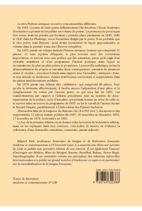 En 1852, paraît un volume intitulé Poèmes antiques dont onze pièces sont reprises d’Hypatie, avec des corrections importantes, et avec une préface qui fait sensation, parce qu’il s’agit d’un véritable manifeste et d’un programme d’action poétique dans lequel se reconnaîtront de plus en plus poètes et prosateurs. La nouvelle esthétique prône la désactualisation du propos avec la parution de plusieurs séries d’« études », exercices formels sans rapport avec l’actualité, « antiques » donc, et d’assez nombreuses corrections et suppressions dans les pièces antérieurement publiées. En 1874, paraît une édition dite « définitive », puis en 1881 les Poèmes antiques, dernière édition, replacée ici dans son contexte.
