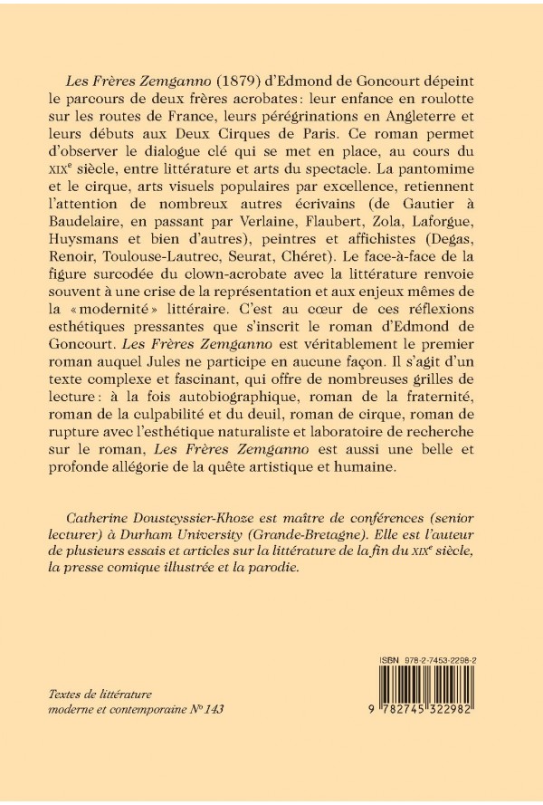 Les Frères Zemganno (1879) d’Edmond de Goncourt dépeint le parcours de deux frères acrobates : leur enfance en roulotte sur les routes de France, leurs pérégrinations en Angleterre et leurs débuts aux Deux Cirques de Paris. Ce roman permet d’observer le dialogue clé qui se met en place, au cours du XIXe siècle, entre littérature et arts du spectacle. La pantomime et le cirque, arts visuels populaires par excellence, retiennent l’attention de nombreux autres écrivains (de Gautier à Baudelaire, en passant par Verlaine, Flaubert, Zola, Laforgue, Huysmans et bien d’autres), peintres et affichistes (Degas, Renoir, Toulouse-Lautrec, Seurat, Chéret). Le face-à-face de la figure surcodée du clown-acrobate avec la littérature renvoie souvent à une crise de la représentation et aux enjeux mêmes de la «modernité » littéraire. C’est au cœur de ces réflexions esthétiques pressantes que s’inscrit le roman d’Edmond de Goncourt. Les Frères Zemganno est véritablement le premier roman auquel Jules ne participe en aucune façon. Il s’agit d’un texte complexe et fascinant, qui offre de nombreuses grilles de lecture : à la fois autobiographique, roman de la fraternité, roman de la culpabilité et du deuil, roman de cirque, roman de rupture avec l’esthétique naturaliste et laboratoire de recherche sur le roman, Les Frères Zemganno est aussi une belle et profonde allégorie de la quête artistique et humaine. Catherine Dousteyssier-Khoze est maître de conférences (senior lecturer) à Durham University (Grande-Bretagne). Elle est l’auteur de plusieurs essais et articles sur la littérature de la fin du XIXe siècle, la presse comique illustrée et la parodie.