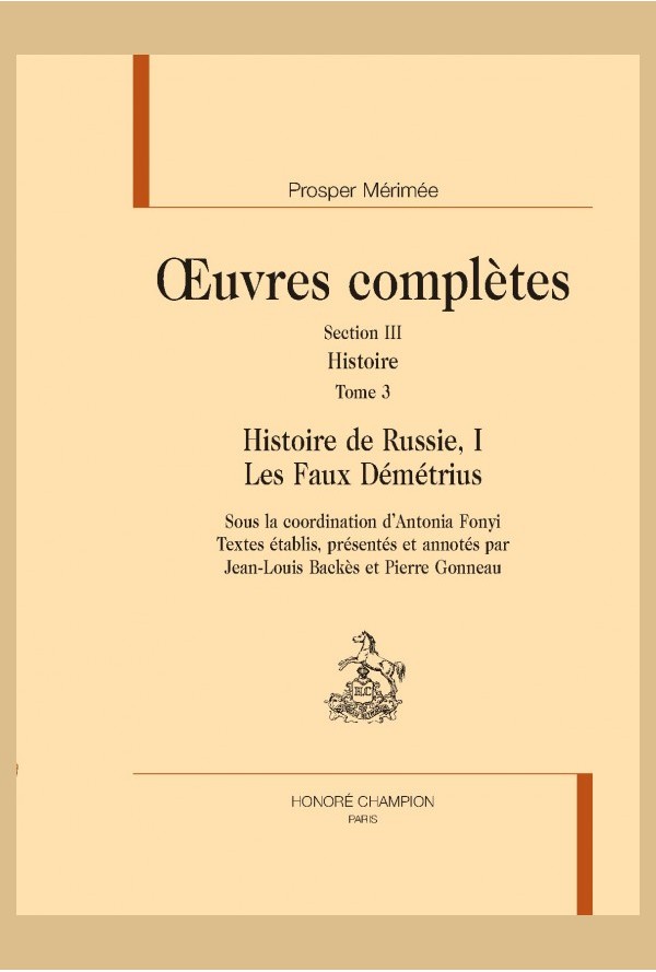 Traducteur et critique de Pouchkine, de Gogol, de Tourgueniev, Mérimée nous a aussi laissé d’importantes études sur l’histoire russe. Dans Épisode de l’histoire de Russie. Les Faux Démétrius, il campe la figure d’un imposteur qui avait l’étoffe d’un grand roi. Ses projets réformateurs, inacceptables pour la noblesse traditionaliste, lui coûtèrent la vie ; Pierre le Grand, le fondateur de la Russie moderne, les réalisera, dans un autre siècle. Élaboration littéraire autour du même héros, Les Débuts d’un aventurier propose une hypothèse pour expliquer les origines énigmatiques du jeune prodige que fut Démétrius. Le volume contient, en outre, deux articles sur l’époque, que Mérimée n’a pas recueillis. Jean-Louis Backès, professeur émérite à l’Université de Paris- Sorbonne, a publié des études sur Pouchkine, sur la poésie romantique en Europe et sur la survie littéraire des mythes antiques. Pierre Gonneau enseigne l’histoire russe à l’Université Paris- Sorbonne et à l’École pratique des Hautes Études. Il s’intéresse notamment à la formation de l’Empire russe et à ses mythes fondateurs.