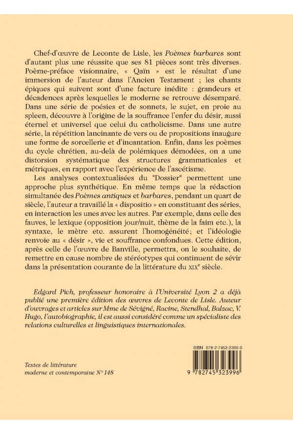 Chef-d’œuvre de Leconte de Lisle, les Poèmes barbares sont d’autant plus une réussite que ses 81 pièces sont très diverses. Poème-préface visionnaire, « Qaïn » est le résultat d’une immersion de l’auteur dans l’Ancien Testament ; les chants épiques qui suivent sont d’une facture inédite : grandeurs et décadences après lesquelles le moderne se retrouve désemparé. Dans une série de poésies et de sonnets, le sujet, en proie au spleen, découvre à l’origine de la souffrance l’enfer du désir, aussi éternel et universel que celui du catholicisme. Dans une autre série, la répétition lancinante de vers ou de propositions inaugure une forme de sorcellerie et d’incantation. Enfin, dans les poèmes du cycle chrétien, au-delà de polémiques démodées, on a une distorsion systématique des structures grammaticales et métriques, en rapport avec l’expérience de l’ascétisme. Les analyses contextualisées du "Dossier" permettent une approche plus synthétique. En même temps que la rédaction simultanée des Poèmes antiques et barbares, pendant un quart de siècle, l’auteur a travaillé la « dispositio » en constituant des séries, en interaction les unes avec les autres. Par exemple, dans celle des fauves, le lexique (opposition jour/nuit, thème de la faim etc.), la syntaxe, le mètre etc. assurent l’homogénéité; et l’idéologie renvoie au « désir », vie et souffrance confondues. Cette édition, après celle de l’œuvre de Banville, permettra, on le souhaite, de remettre en cause nombre de stéréotypes qui continuent de sévir dans la présentation courante de la littérature du XIXe siècle.