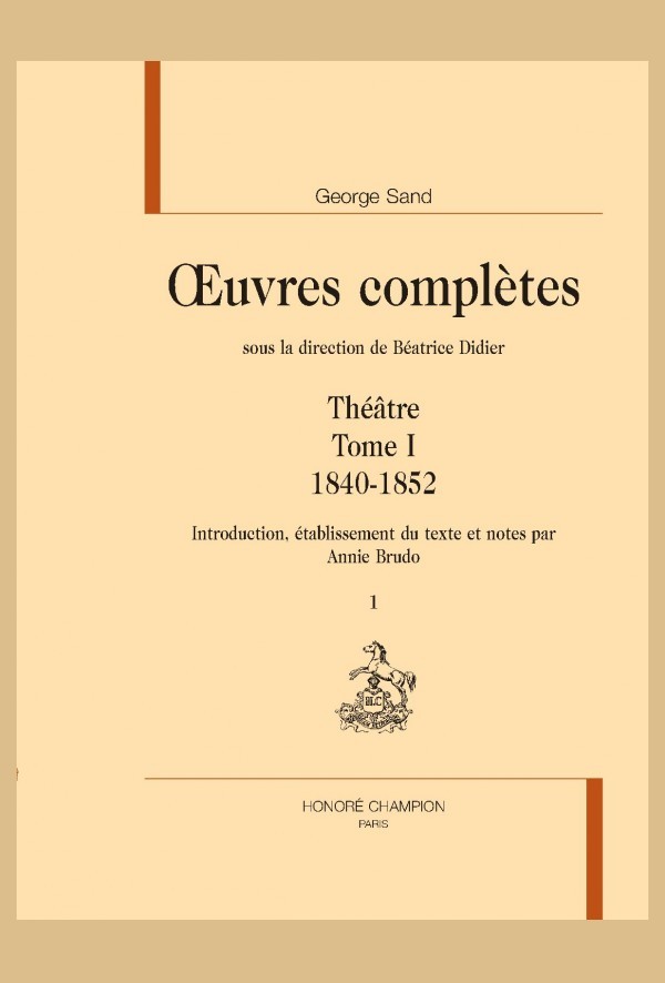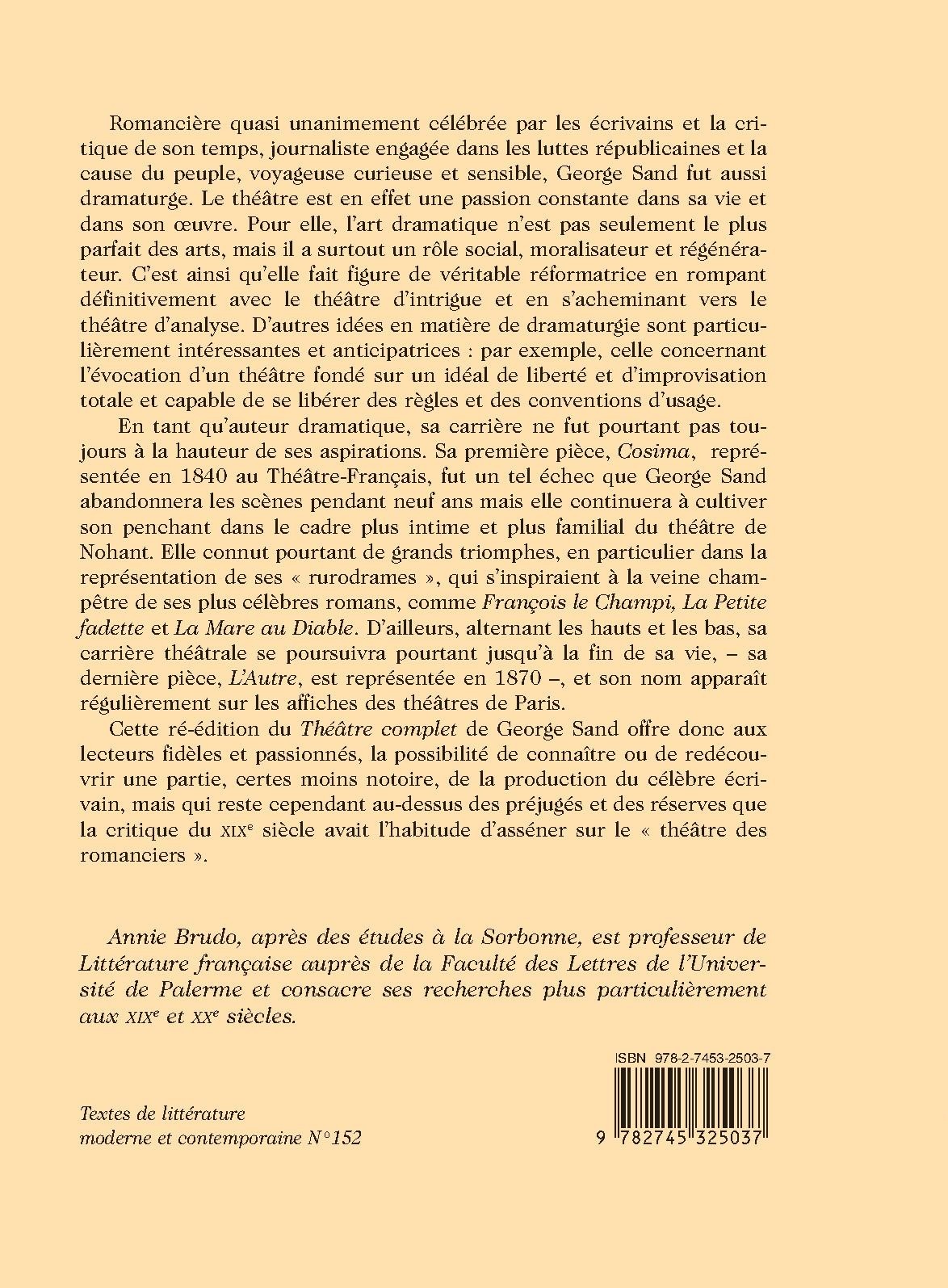 Romancière quasi unanimement célébrée par les écrivains et la critique de son temps, journaliste engagée dans les luttes républicaines et la cause du peuple, voyageuse curieuse et sensible, George Sand fut aussi dramaturge. Le théâtre est en effet une passion constante dans sa vie et dans son oeuvre. Pour elle, l’art dramatique n’est pas seulement le plus parfait des arts, mais il a surtout un rôle social, moralisateur et régénérateur. C’est ainsi qu’elle fait figure de véritable réformatrice en rompant définitivement avec le théâtre d’intrigue et en s’acheminant vers le théâtre d’analyse. D’autres idées en matière de dramaturgie sont particulièrement intéressantes et anticipatrices : par exemple, celle concernant l’évocation d’un théâtre fondé sur un idéal de liberté et d’improvisation otale et capable de se libérer des règles et des conventions d’usage. En tant qu’auteur dramatique, sa carrière ne fut pourtant pas toujours à la hauteur de ses aspirations. Sa première pièce, Cosima, représentée en 1840 au Théâtre-Français, fut un tel échec que George Sand abandonnera les scènes pendant neuf ans mais elle continuera à cultiver son penchant dans le cadre plus intime et plus familial du théâtre de Nohant. Elle connut pourtant de grands triomphes, en particulier dans la représentation de ses « rurodrames », qui s’inspiraient à la veine champêtre de ses plus célèbres romans, comme François le Champi, La Petite fadette et La Mare au Diable. D’ailleurs, alternant les hauts et les bas, sa carrière théâtrale se poursuivra pourtant jusqu’à la fin de sa vie, – sa dernière pièce, L’Autre, est représentée en 1870 –, et son nom apparaît régulièrement sur les affiches des théâtres de Paris. Cette ré-édition du Théâtre complet de George Sand offre donc aux lecteurs fidèles et passionnés, la possibilité de connaître ou de redécouvrir une partie, certes moins notoire, de la production du célèbre écrivain, mais qui reste cependant au-dessus des préjugés et des réserves que la critique du XIXe siècle avait l’habitude d’asséner sur le « théâtre des romanciers ».