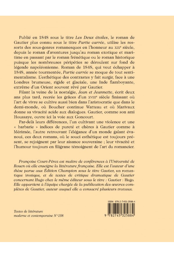 Françoise Court-Pérez est maître de conférences à l’Université de Rouen où elle enseigne la littérature française. Elle est l’auteur d’une thèse parue aux Édition Champion sous le titre Gautier, un romantique ironique, et de textes de critique dramatique de Gautier concernant Hugo chez le même éditeur sous le titre : Gautier : Hugo. Elle appartient à l’équipe chargée de la publication des oeuvres complètes de Gautier, auteur auquel elle a consacré plusieurs travaux.