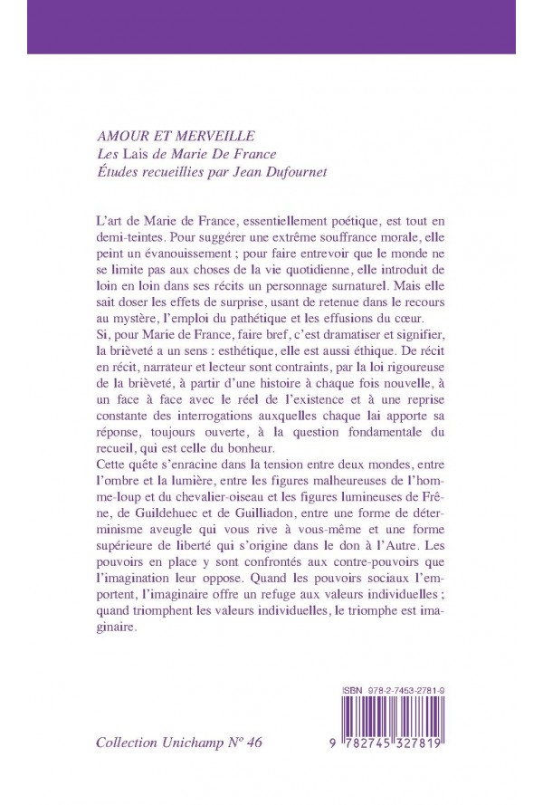 au mystère, l’emploi du pathétique et les effusions du coeur. Si, pour Marie de France, faire bref, c’est dramatiser et signifier, la brièveté a un sens : esthétique, elle est aussi éthique. De récit en récit, narrateur et lecteur sont contraints, par la loi rigoureuse de la brièveté, à partir d’une histoire à chaque fois nouvelle, à un face à face avec le réel de l’existence et à une reprise constante des interrogations auxquelles chaque lai apporte sa réponse, toujours ouverte, à la question fondamentale du recueil, qui est celle du bonheur.