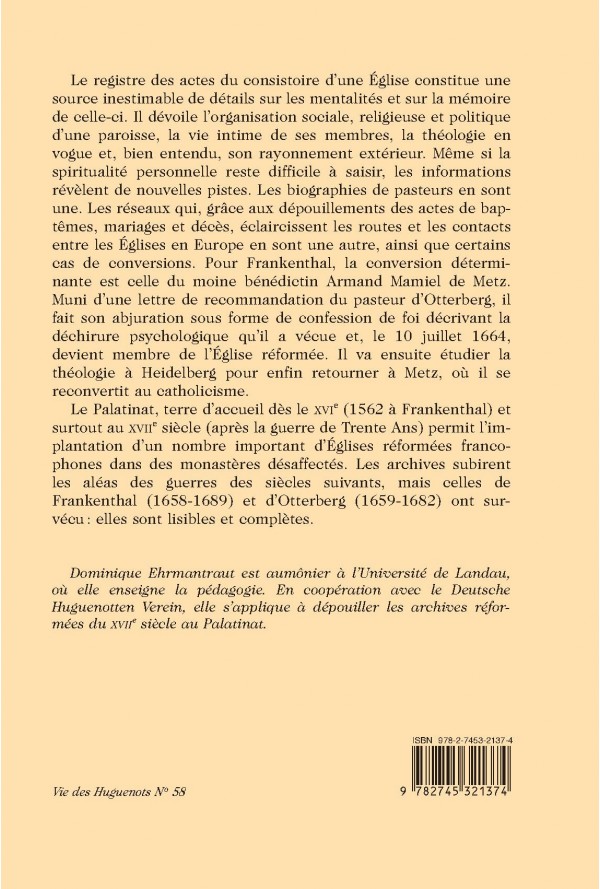 Le registre des actes du consistoire d`une Église constitue une source inestimable de détails sur les mentalités et sur la mémoire de celle-ci. Il dévoile l`organisation sociale, religieuse et politique d`une paroisse, la vie intime de ses membres, la théologie en vogue et, bien entendu, son rayonnement extérieur. Même si la spiritualité personnelle reste difficile à saisir, les informations révèlent de nouvelles pistes. Les biographies de pasteurs en sont une. Les réseaux qui, grâce aux dépouillements des actes de baptêmes, mariages et décès, éclaircissent les routes et les contacts entre les Églises en Europe en sont une autre, ainsi que certains cas de conversions. Pour Frankenthal, la conversion déterminante est celle du moine bénédictin Armand Mamiel de Metz. Muni d`une lettre de recommandation du pasteur d`Otterberg, il fait son abjuration sous forme de confession de foi décrivant la déchirure psychologique qu`il a vécue et, le 10 juillet 1664, devient membre de l`Église réformée. Il va ensuite étudier la théologie à Heidelberg pour enfin retourner à Metz, où il se reconvertit au catholicisme. Le Palatinat, terre d`accueil dès le XVIe (1562 à Frankenthal) et surtout au XVIIe siècle (après la guerre de Trente Ans) permit l`implantation d`un nombre important d`Églises réformées francophones dans des monastères désaffectés. Les archives subirent les aléas des guerres des siècles suivants, mais celles de Frankenthal (1658-1689) et d`Otterberg (1659-1682) ont survécu : elles sont lisibles et complètes. Dominique Ehrmantraut est aumônier à l`Université de Landau, où elle enseigne la pédagogie. En coopération avec le Deutsche Huguenotten Verein, elle s`applique à dépouiller les archives réformées du XVIIe siècle au Palatinat.
