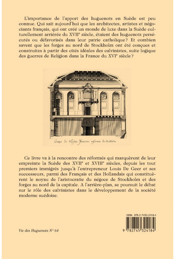 L’importance de l’apport des huguenots en Suède est peu connue. Qui sait aujourd’hui que les architectes, artistes et négociants français, qui ont créé un monde de luxe dans la Suède culturellement arriérée du XVIIe siècle, étaient des huguenots persécutés ou défavorisés dans leur patrie catholique? Et combien savent que les forges au nord de Stockholm ont été conçues et construites à partir des cités idéales des calvinistes, suite logique des guerres de Religion dans la France du XVIe siècle?