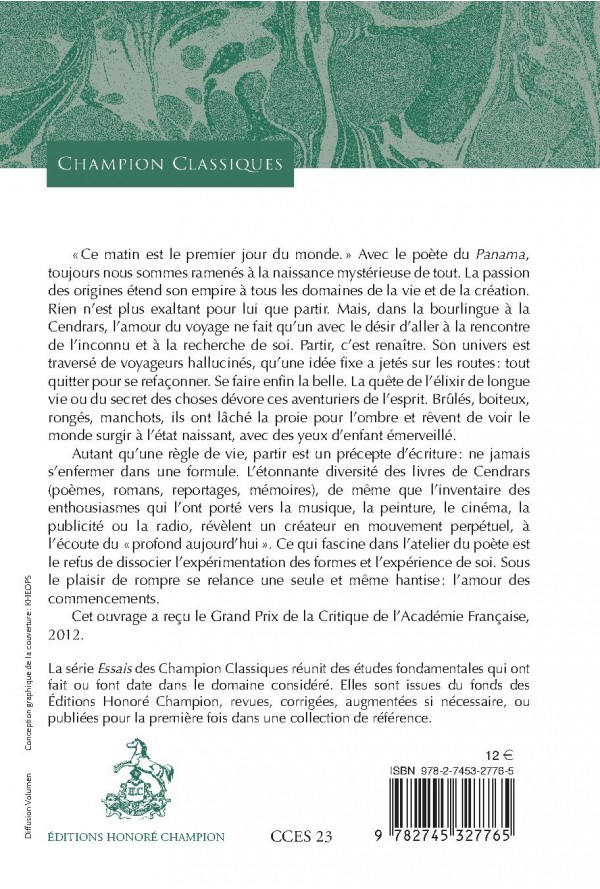 Autant qu’une règle de vie, partir est un précepte d’écriture : ne jamais s’enfermer dans une formule. L’étonnante diversité des livres de Cendrars (poèmes, romans, reportages, mémoires), de même que l’inventaire des enthousiasmes qui l’ont porté vers la musique, la peinture, le cinéma, la publicité ou la radio, révèlent un créateur en mouvement perpétuel, à l’écoute du «profond aujourd’hui ». Ce qui fascine dans l’atelier du poète est le refus de dissocier l’expérimentation des formes et l’expérience de soi. Sous le plaisir de rompre se relance une seule et même hantise : l’amour des commencements.