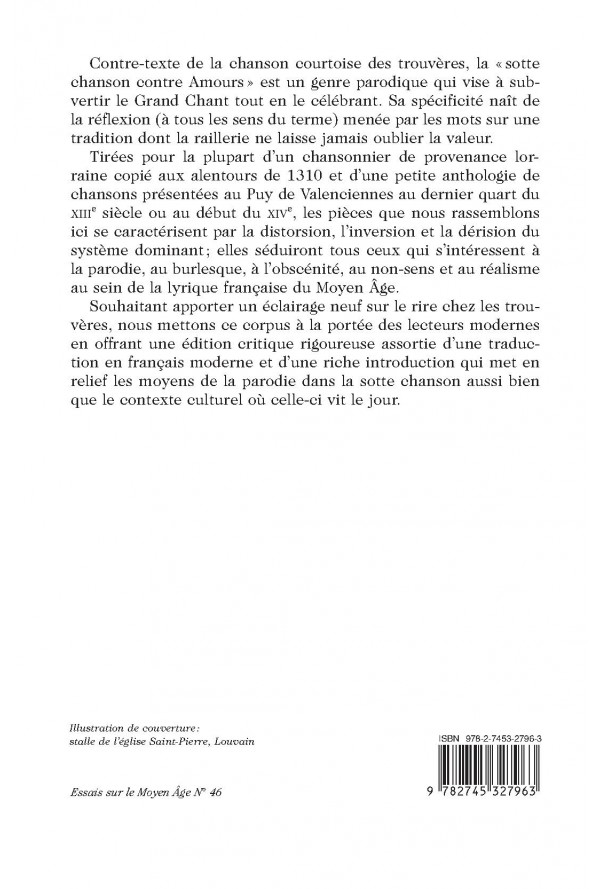 XIIIe siècle ou au début du XIVe, les pièces que nous rassemblons ici se caractérisent par la distorsion, l’inversion et la dérision du système dominant ; elles séduiront tous ceux qui s’intéressent à la parodie, au burlesque, à l’obscénité, au non-sens et au réalisme au sein de la lyrique française du Moyen Âge. Souhaitant apporter un éclairage neuf sur le rire chez les trouvères, nous mettons ce corpus à la portée des lecteurs modernes en offrant une édition critique rigoureuse assortie d’une traduction en français moderne et d’une riche introduction qui met en relief les moyens de la parodie dans la sotte chanson aussi bien que le contexte culturel où celle-ci vit le jour.