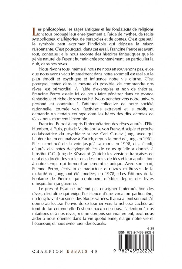 neuf des dix études sur le sens des contes de fées et leur application à notre temps qui forment un ensemble unique. Avec son mari, Etienne Perrot, écrivain et traducteur d’oeuvres maîtresses de la maturité de Jung, ont été fondées, en 1978, « Les Éditions de la Fontaine de Pierre» qui continuent d’éditer depuis des livres d’inspiration junguienne.