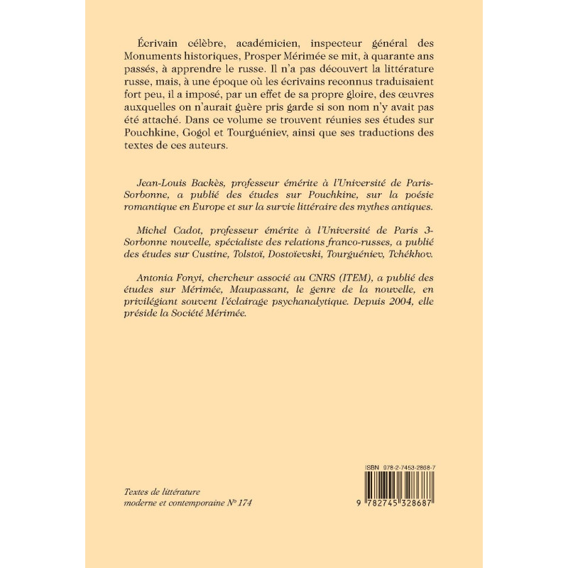 Écrivain célèbre, académicien, inspecteur général des Monuments historiques, Prosper Mérimée se mit, à quarante ans passés, à apprendre le russe. Il n’a pas découvert la littérature russe, mais, à une époque où les écrivains reconnus traduisaient fort peu, il a imposé, par un effet de sa propre gloire, des œuvres auxquelles on n’aurait guère pris garde si son nom n’y avait pas été attaché. Dans ce volume se trouvent réunies ses études sur Pouchkine, Gogol et Tourguéniev, ainsi que ses traductions des textes de ces auteurs.