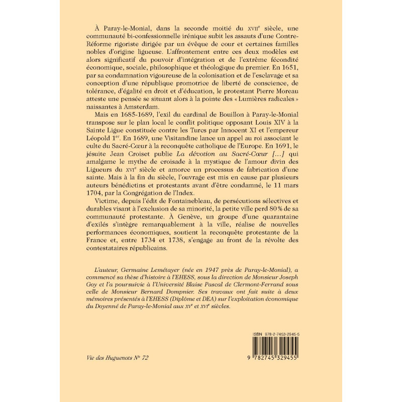 L’auteur, Germaine Lemétayer (née en 1947 près de Paray-le-Monial), a commencé sa thèse d’histoire à l’EHESS, sous la direction de Monsieur Joseph Goy et l’a poursuivie à l’Université Blaise Pascal de Clermont-Ferrand sous celle de Monsieur Bernard Dompnier. Ses travaux ont fait suite à deux mémoires présentés à l’EHESS (Diplôme et DEA) sur l’exploitation économique du Doyenné de Paray-le-Monial aux XVe et XVIe siècles.
