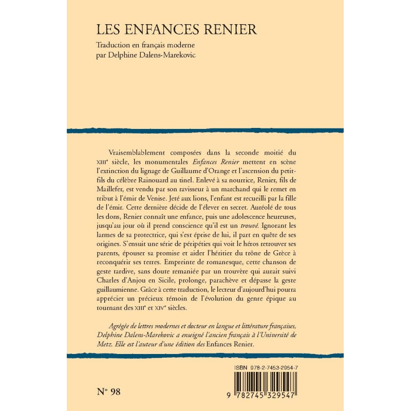Vraisemblablement composées dans la seconde moitié du XIIIe siècle, les monumentales Enfances Renier mettent en scène l’extinction du lignage de Guillaume d’Orange et l’ascension du petit-fils du célèbre Rainouard au tinel. Enlevé à sa nourrice, Renier, fils de Maillefer, est vendu par son ravisseur à un marchand qui le remet en tribut à l’émir de Venise. Jeté aux lions, l’enfant est recueilli par la fille de l’émir. Cette dernière décide de l’élever en secret. Auréolé de tous les dons, Renier connaît une enfance, puis une adolescence heureuses, jusqu’au jour où il prend conscience qu’il est un trouvé. Ignorant les larmes de sa protectrice, qui s’est éprise de lui, il part en quête de ses origines. S’ensuit une série de péripéties qui voit le héros retrouver ses parents, épouser sa promise et aider l’héritier du trône de Grèce à reconquérir ses terres. Empreinte de romanesque, cette chanson de geste tardive, sans doute remaniée par un trouvère qui aurait suivi Charles d’Anjou en Sicile, prolonge, parachève et dépasse la geste guillaumienne. Grâce à cette traduction, le lecteur d’aujourd’hui pourra apprécier un précieux témoin de l’évolution du genre épique au tournant des XIIIe et XIVe siècles.