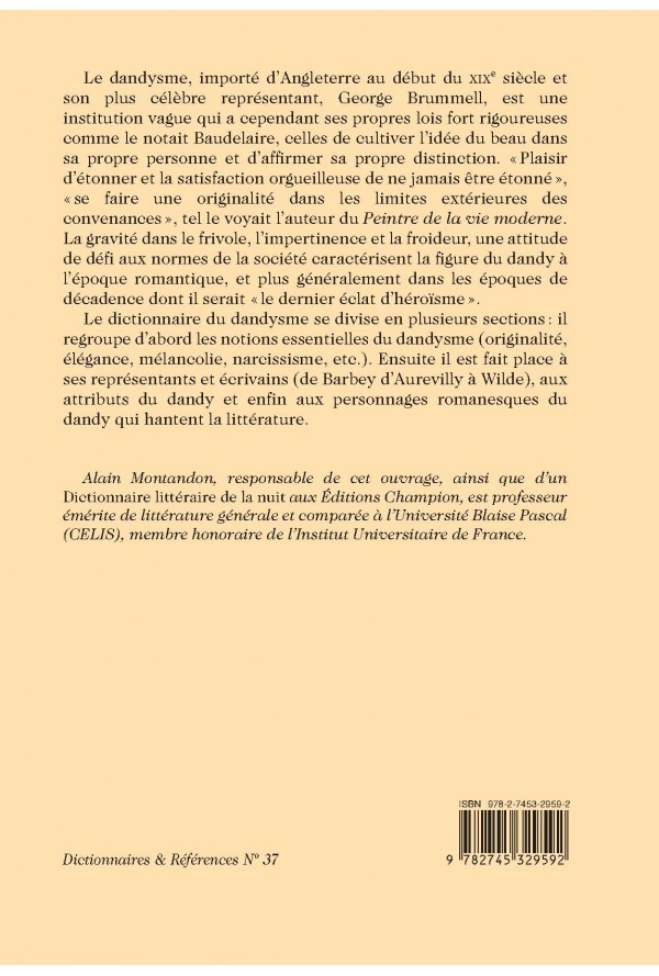 Le dandysme, importé d’Angleterre au début du XIXe siècle et son plus célèbre représentant, George Brummell, est une institution vague qui a cependant ses propres lois fort rigoureuses comme le notait Baudelaire, celles de cultiver l’idée du beau dans sa propre personne et d’affirmer sa propre distinction. « Plaisir d’étonner et la satisfaction orgueilleuse de ne jamais être étonné », « se faire une originalité dans les limites extérieures des convenances », tel le voyait l’auteur du Peintre de la vie moderne. La gravité dans le frivole, l’impertinence et la froideur, une attitude de défi aux normes de la société caractérisent la figure du dandy à l’époque romantique, et plus généralement dans les époques de décadence dont il serait « le dernier éclat d’héroïsme ». Le dictionnaire du dandysme se divise en plusieurs sections : il regroupe d’abord les notions essentielles du dandysme (originalité, élégance, mélancolie, narcissisme, etc.). Ensuite il est fait place à ses représentants et écrivains (de Barbey d’Aurevilly à Wilde), aux attributs du dandy et enfin aux personnages romanesques du dandy qui hantent la littérature.