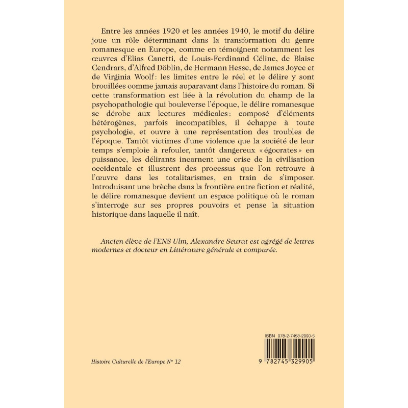 Entre les années 1920 et les années 1940, le motif du délire joue un rôle déterminant dans la transformation du genre romanesque en Europe, comme en témoignent notamment les œuvres d’Elias Canetti, de Louis-Ferdinand Céline, de Blaise Cendrars, d’Alfred Döblin, de Hermann Hesse, de James Joyce et de Virginia Woolf : les limites entre le réel et le délire y sont brouillées comme jamais auparavant dans l’histoire du roman. Si cette transformation est liée à la révolution du champ de la psychopathologie qui bouleverse l’époque, le délire romanesque se dérobe aux lectures médicales : composé d’éléments hétérogènes, parfois incompatibles, il échappe à toute psychologie, et ouvre à une représentation des troubles de l’époque. Tantôt victimes d’une violence que la société de leur temps s’emploie à refouler, tantôt dangereux « égocrates » en puissance, les délirants incarnent une crise de la civilisation occidentale et illustrent des processus que l’on retrouve à l’œuvre dans les totalitarismes, en train de s’imposer. Introduisant une brèche dans la frontière entre fiction et réalité, le délire romanesque devient un espace politique où le roman s’interroge sur ses propres pouvoirs et pense la situation historique dans laquelle il naît.